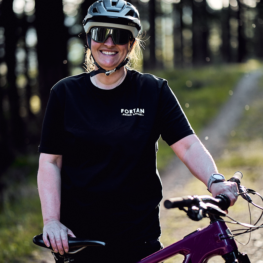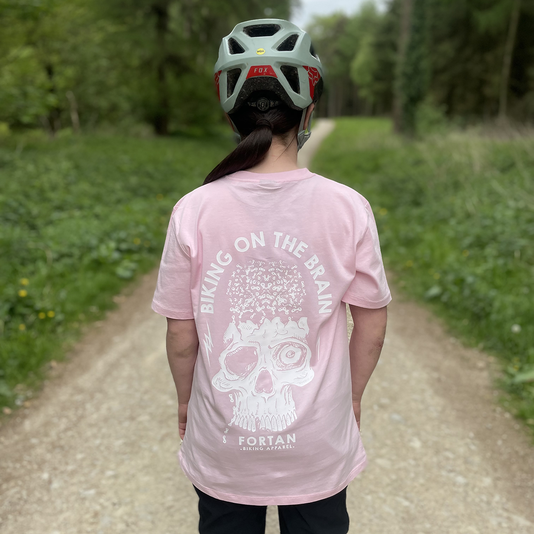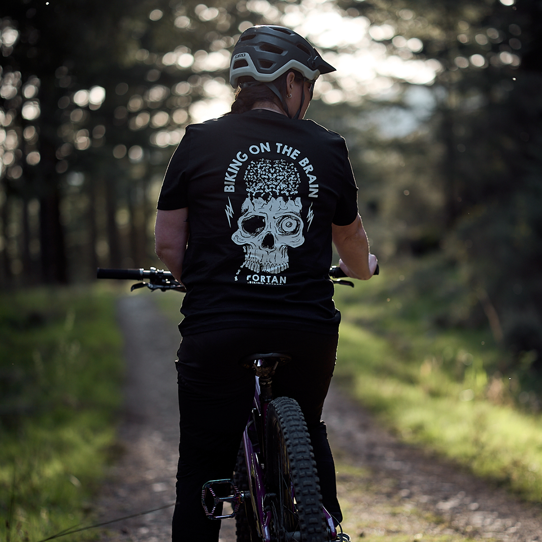 Large Skull Biking on the Brain illustration on the back with Fortan Biking Apparel logo on front chest.